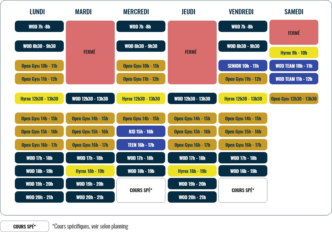 La salle est adaptée pour les WOD et les défis fonctionnels : barres olympiques, boîtes de saut, de cordes à grimper, anneaux de gymnastique, élastiques de résistance, medicine balls, espace étirements et récupération.